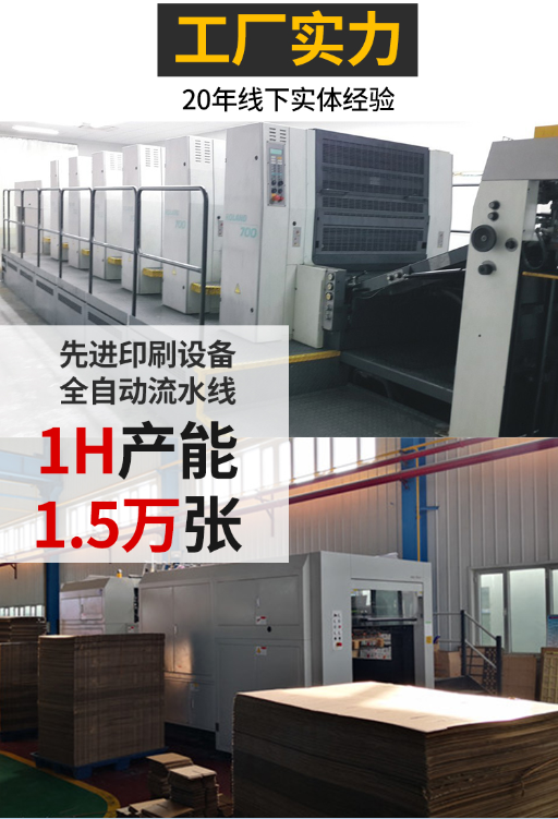 公司拥有完整的纸箱纸盒生产线,全部采用绿色环保的原料进行生产,包装盒的加工生产都有整套的统一的作业品管流程包证,严谨科学的管理使得们的产品保持完品质,们生产的包装盒质感光滑、平整、手感细腻,同时拥有光彩夺目的视觉效果,是其传统包装所不能比的。
